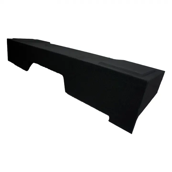 We finally have a custom fit enclosure available for the new body style 07-13 Chevy Silverado / GMC Sierra extended cab truck! This dual 10″ enclosure is designed to fit under the rear bench seat and is a down firing model. Why down firing? Not only does it help improve the overall SPL output of the subwoofers but it also keeps the subs out of view for security reasons. This enclosure is compatible with a wide range of sub brands and model but entry level and flat piston subwoofers tend to work best. Our boxes are made from precision cuts of MDF. They are then l